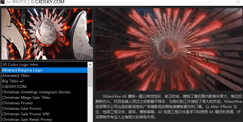 AE模板合集一直以特效炫彩、前卫时尚、模板工整在国内影响非常大,每位后期制作人、栏目包装人用过之后都爱不释手,为我们的工作减轻了很大的负担。VideoHive视频单元公司出品的影视电机广告等影视后期包装模板素材热门集。以After Effects 为主,包括工程文件,脚本,模板等等。AE炫丽工程文件是学习和使用AE最好的资源。对后期制作专业人士有极大的帮助作用.