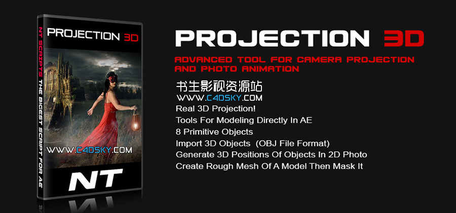 AEscripts Projection 3D是一款由nataworkstudio编写的摄像机投影映射和三维图片视差动画脚本,一款真正的3D投影映射工具,包括8种基础模型 ,而且还可以导入三维对象模型(OBJ文件格式),在二维图片生成三维对象位置,创建粗模网格,还可以对图片进行曲线弯曲变形等等.